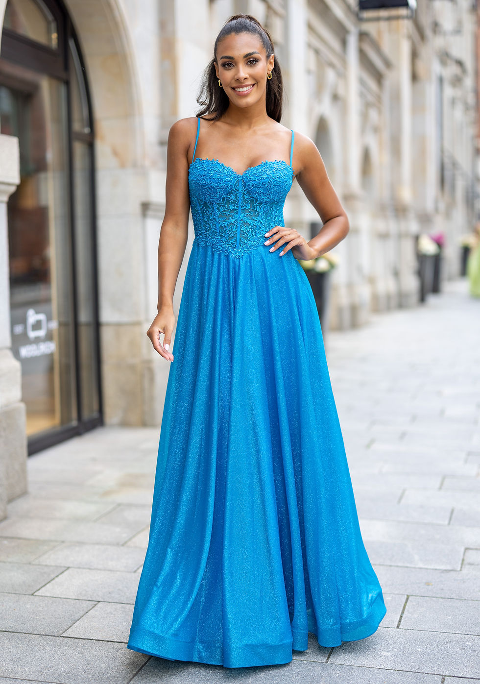- Princess style aline prom dress with embroidered bodice, spaghetti straps and glitter tulle skirt- Available in Malibu Blue- Not available for reorder - First Come First Served